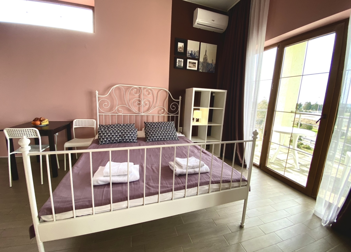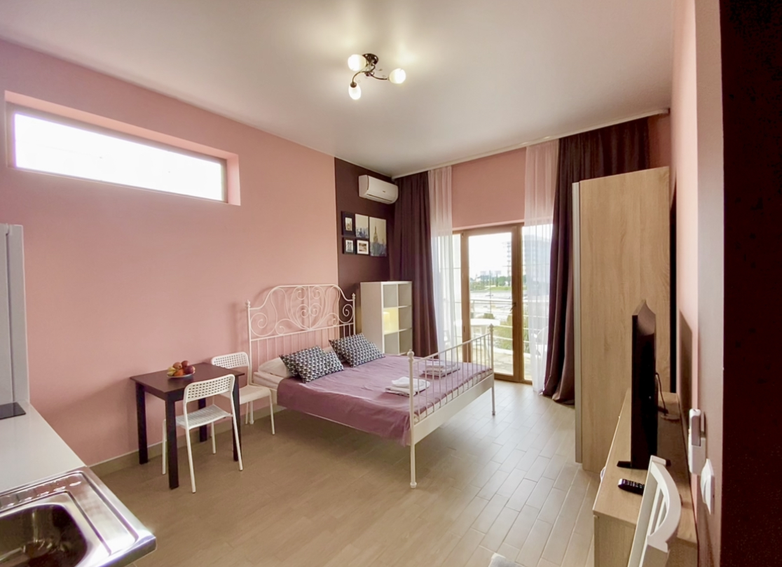 Самолетом до аэропорта Адлер, далее на электричке до станции Адлер, затем пересадка на маршрутке №560 до остановки «Бар Терраса», затем пройти 450 м до апарт-отеля.